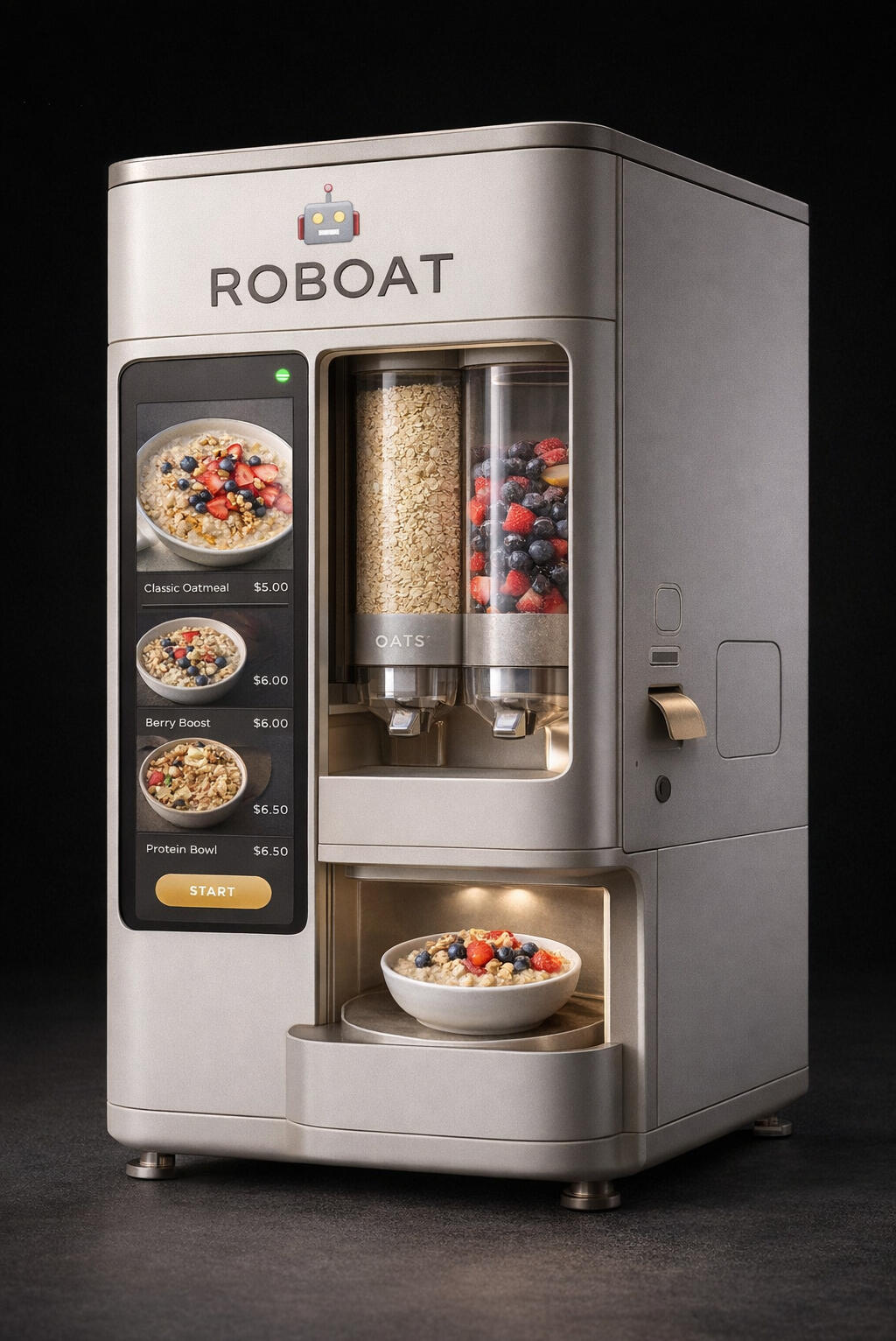 Roboat™ – Automated Healthy Oatmeal SystemRoboat™ is a fully enclosed, automated oatmeal vending system designed to deliver fresh, warm, and nutritious meals in high-traffic environments. Built for seamless deployment in gyms, campuses, offices, and public spaces, the system provides a reliable and efficient alternative to traditional vending solutions.At its core, Roboat™ utilizes a simplified ingredient architecture, combining precision-dispensed oats with controlled hot water preparation and optional fruit-based toppings. By focusing on a single product category, the system reduces mechanical complexity while maintaining consistent output quality and operational reliability.The unit is designed with food safety and hygiene as a priority. Its enclosed preparation environment, minimal liquid handling, and use of long shelf-life ingredients such as dry oats and frozen fruits significantly reduce contamination risks and maintenance frequency compared to traditional automated food systems.From a user perspective, Roboat™ offers a clean and intuitive experience. The touchscreen interface enables quick selection, while the transparent ingredient display reinforces product quality and freshness. The system is optimized for speed, delivering a complete oatmeal bowl within seconds.Built on a modular design framework, Roboat™ supports straightforward maintenance, efficient restocking, and scalable deployment. Its compact footprint and plug-and-play installation make it well-suited for modern environments seeking healthier, automated food solutions without increasing operational overhead.